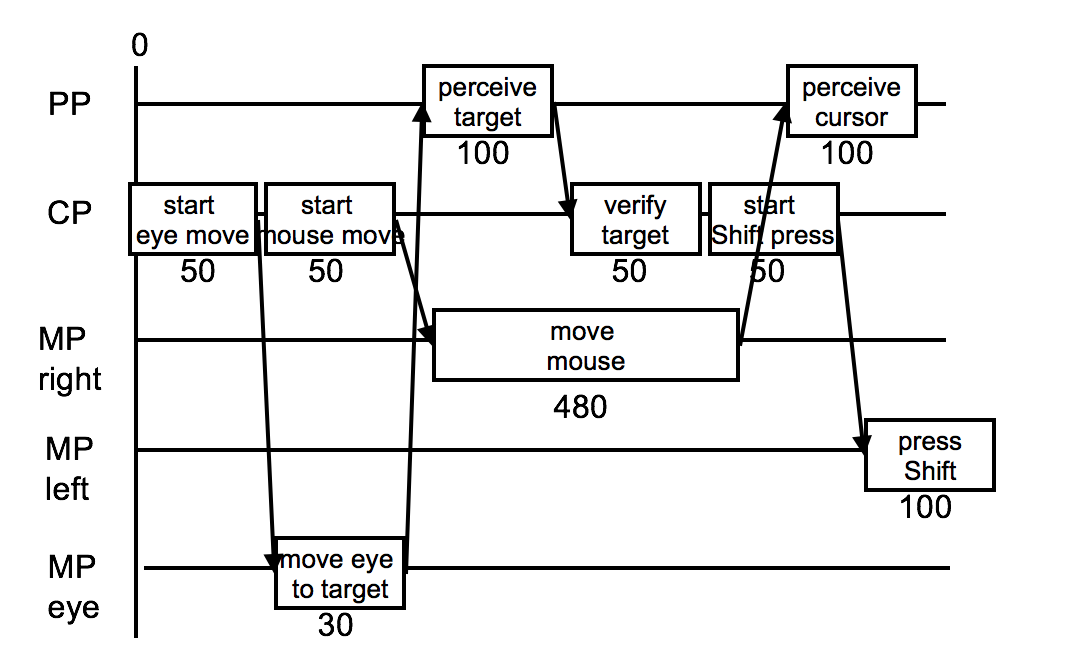 This is a version of the Model Human Processor (MHP), which was developed by Card, Moran, and Newell as a way to summarize decades of psychology research in an engineering model (Card, Moran, Newell, The Psychology of Human-Computer Interaction, Lawrence Erlbaum Associates, 1983).