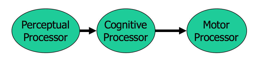 The cognitive processor takes the symbols recognized by the perceptual processor and makes comparisons and decisions. It might also store and fetch symbols in working memory (which you might think of as RAM, although it’s pretty small). The cognitive processor does most of the work that we think of as “thinking”.