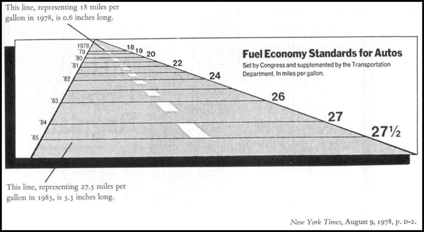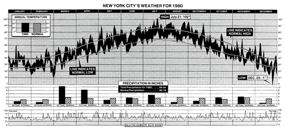 This graph, from the New York Times (Jan. 7, 1979) shows--- both valiantly, and sucessfully--- 2200 numbers which summarize the trends and patterns in weather in New York City in 1980. The three aligned charts show temperature, precipitation, and relative humidity. In the graph of temperature, the area is filled between the daily low and daily high.